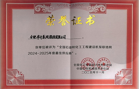 Hefei Huasheng Pumps & Valves Co., Ltd.ha ricevuto di recente il premio “Miglior fornitore”onore da parte del Rete nazionale di pompe per l'ingegneria chimica e petrolifera per il periodo 2024-2025. Questo riconoscimento riflette la solida competenza tecnica dell'azienda, l'affidabilità della qualità dei prodotti e l'eccellente servizio nel campo delle apparecchiature per fluidi per l'industria petrolifera e chimica.